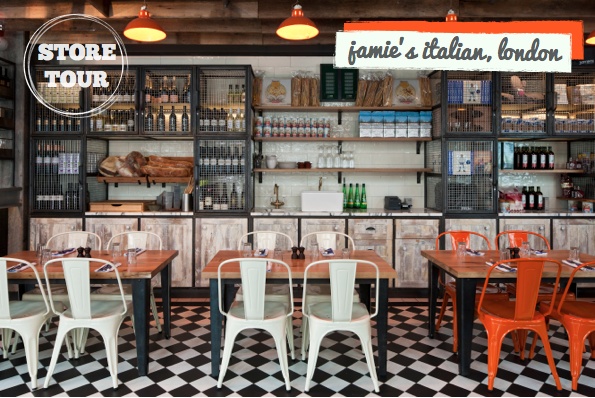 Touch of black and white, wood, long tables, and exposed shelving and cupboards....